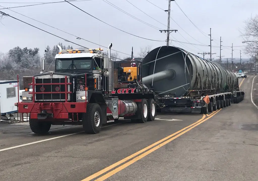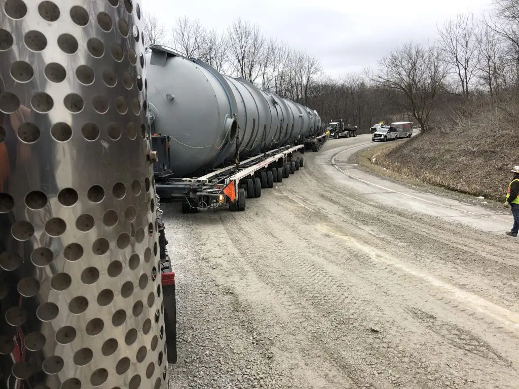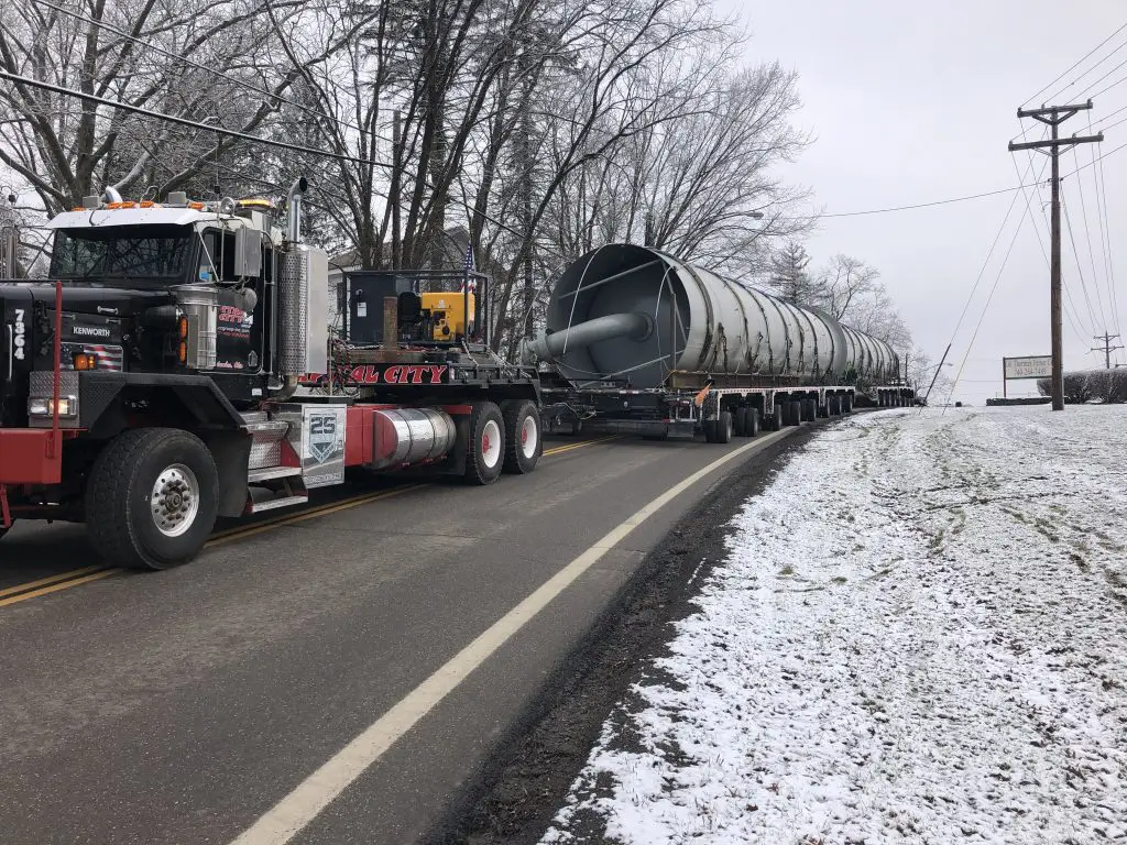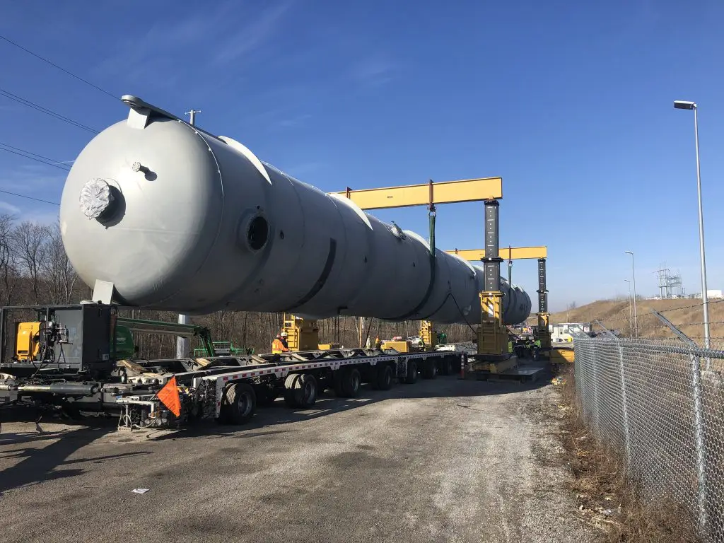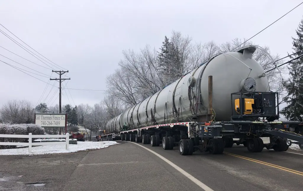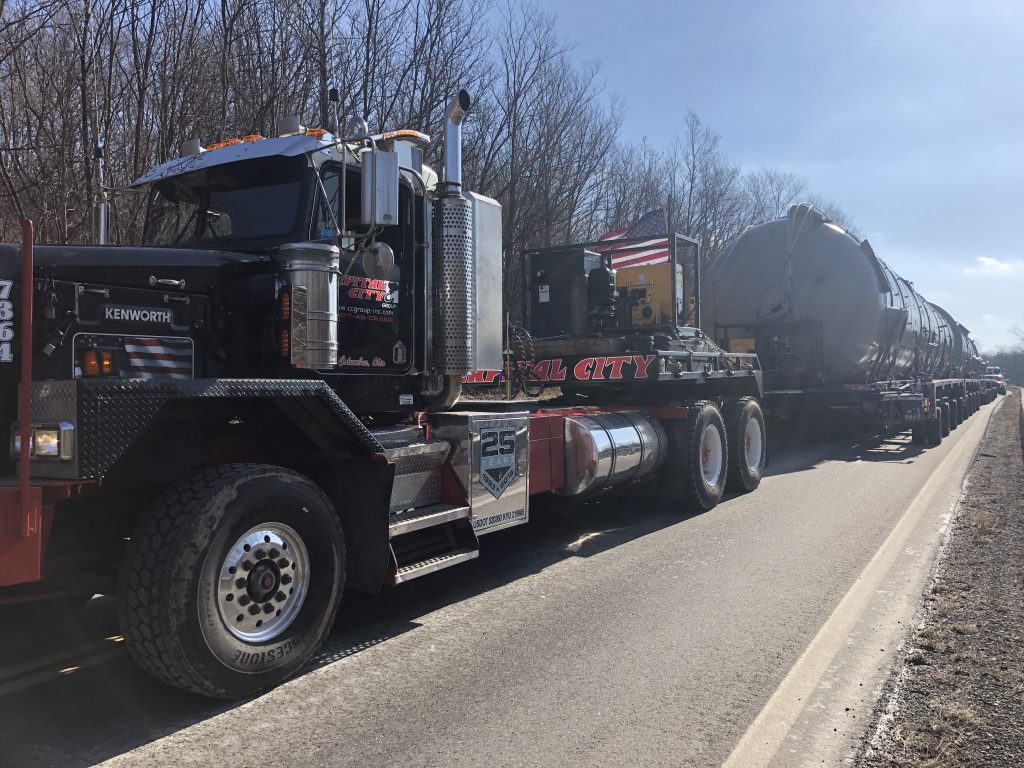 Capital City Group completed a project with a Scheuerle HighwayGiant dual lane transporter where we transported 3 towers for MarkWest in Hopedale, Ohio. The towers weighed up to 625,000 pounds, were up to 192 feet long, 14 feet wide, and over 14 feet tall. Capital City had to complete the 35 mile project while also having to deal with various transportation restrictions over a 2 day period for each tower.