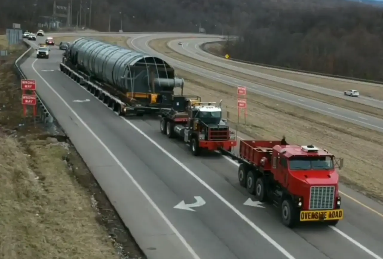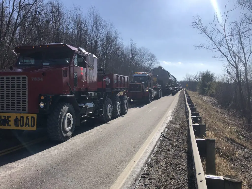 The move was completed on a customized Scheuerle HighwayGiant consisting of 16 lines and 3 prime movers. The gross weight was 965,000 pounds, an a overall length of 350 feet, and 17’4″ tall. Due to weight limitations the towers were required to travel on the weekend with 6 bucket trucks, 12 police, and ODOT/WV officials.