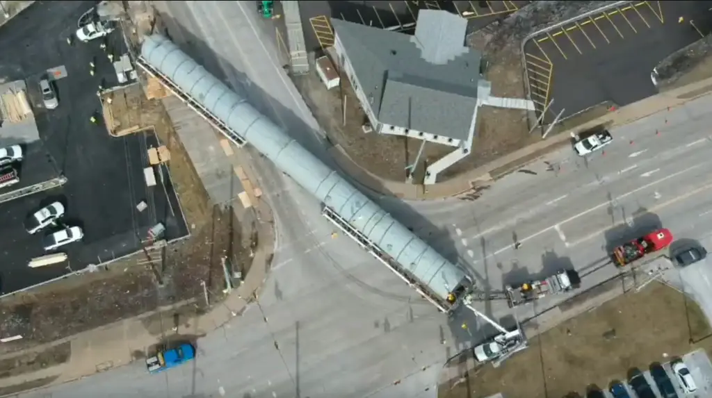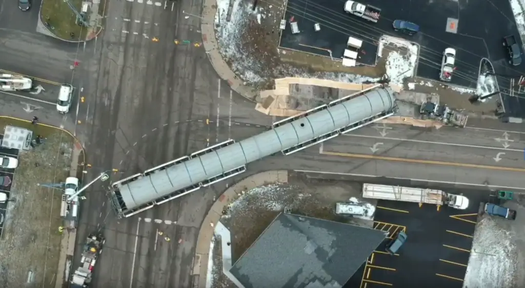 The project took well over a year of planning and the transporter had special inserts manufactured to reduce the overall height down to 17’4″ to contend with ODOT height requirements.