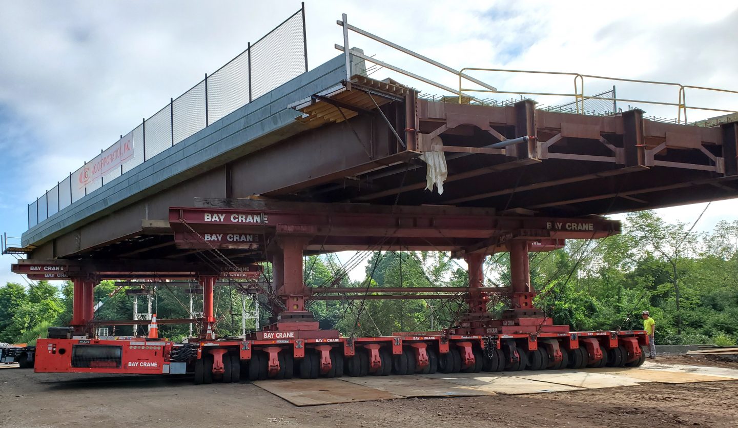 The lift, transport, and set of the two new Elm Street Bridges were accomplished safely and without incident. Several Bay Crane branches combined efforts to meet the challenges of the project. And the success of this project is attributed to many months of planning, document submittals, approvals, on-site meetings and extraordinary teamwork exhibited by the State of Connecticut, the numerous contractors involved and the many craft employees on the job.